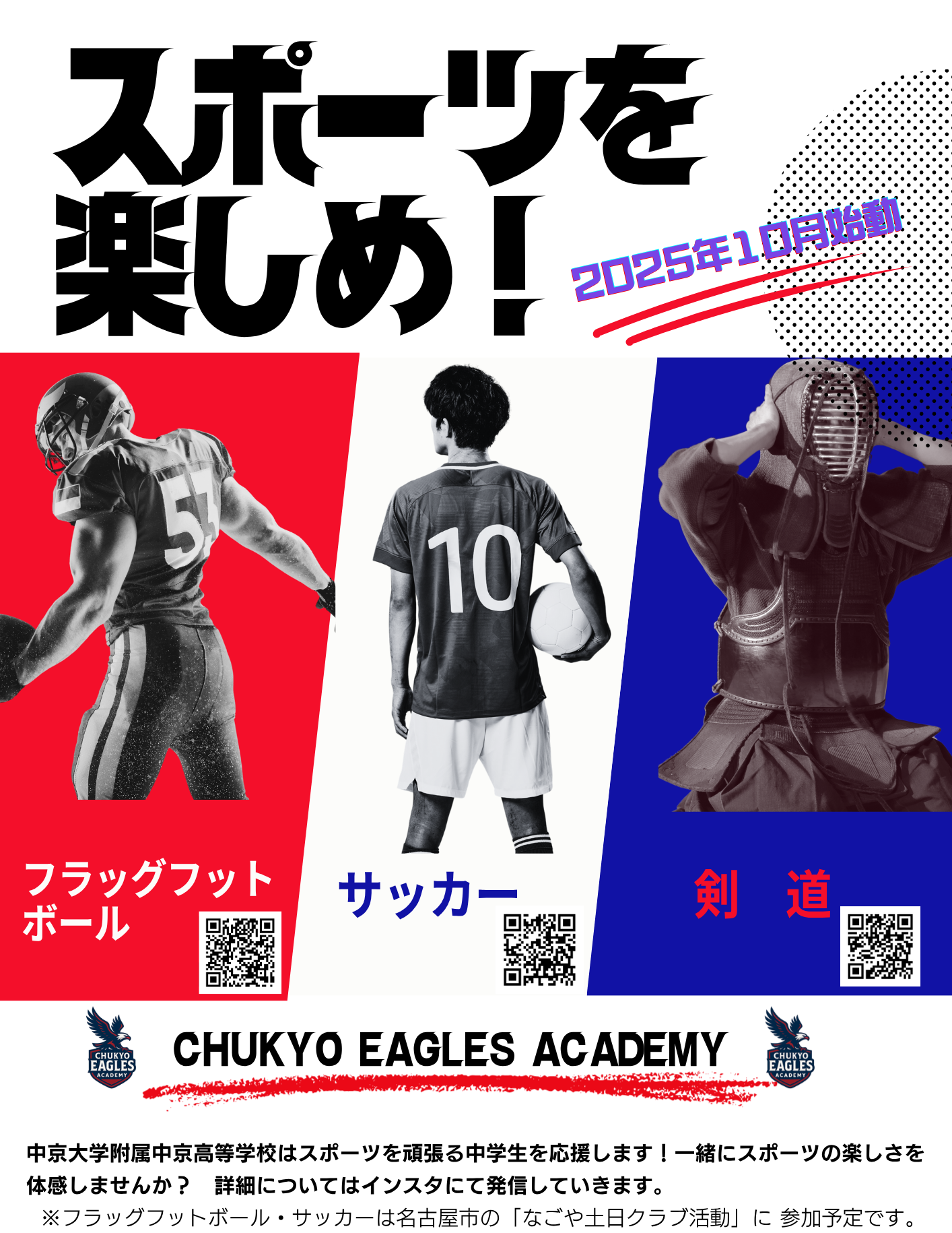 chukyo eagles academy(中京イーグルスアカデミー)は中京大学附属中京高等学校が地域貢献、社会連携を目的として活動する団体です。小中学生のためにスポーツスクールを開講し、スポーツの場の提供をいたします。様々なイベントを開催いたしますので是非ご参加ください。なお本団体は名古屋市教育委員会が主催する「なごや土日クラブ活動ポータル」へ団体登録をし、原則土日の活動ができなくなった部活動をサポートいたします。