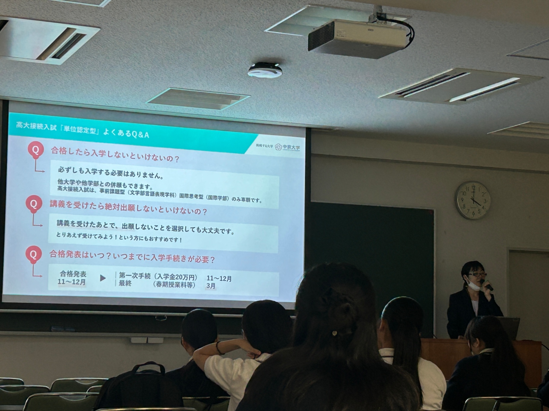 高校在学中に中京大学の学部授業を受講することで、大学入学前から大学単位の一部を先行して取得できます。進学文系コース3年生(他大クラス以外)が対象で、4〜7月の木曜1・2限に実施される学期(春)型と、10〜12月の土曜日に実施される集中型があります。