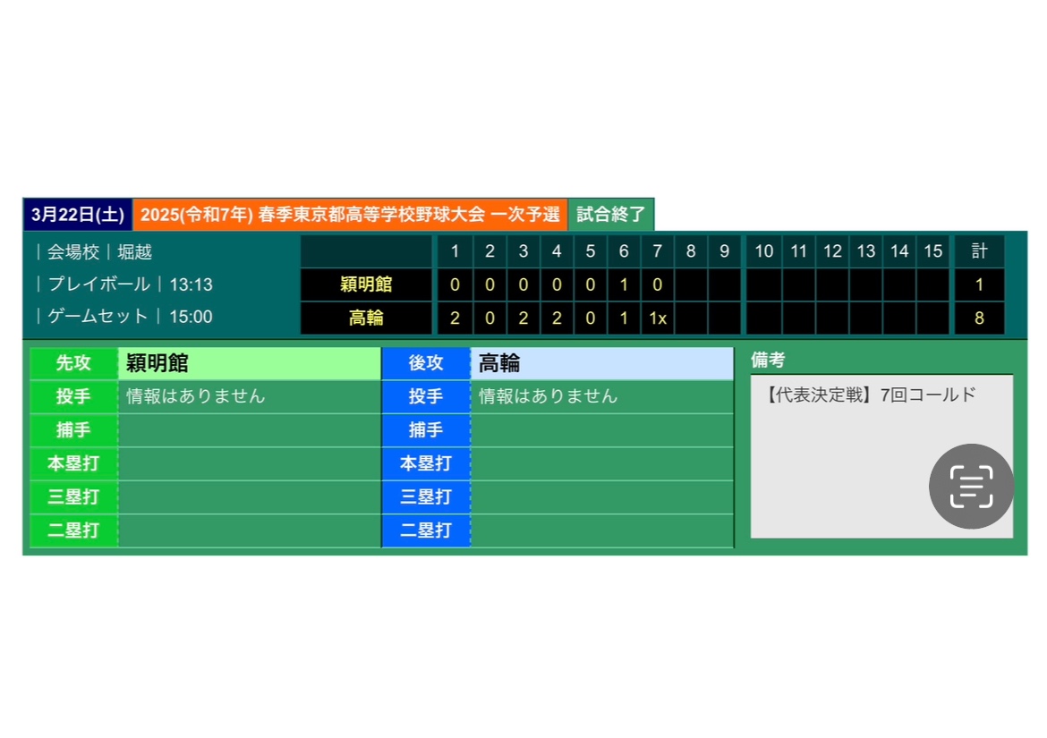 3月22日に本校敷地内野球場(堀越球場)にて、春季大会一次予選のブロック決勝が行われ、高輪高等学校と対戦いたしました。結果は以下の通りです。