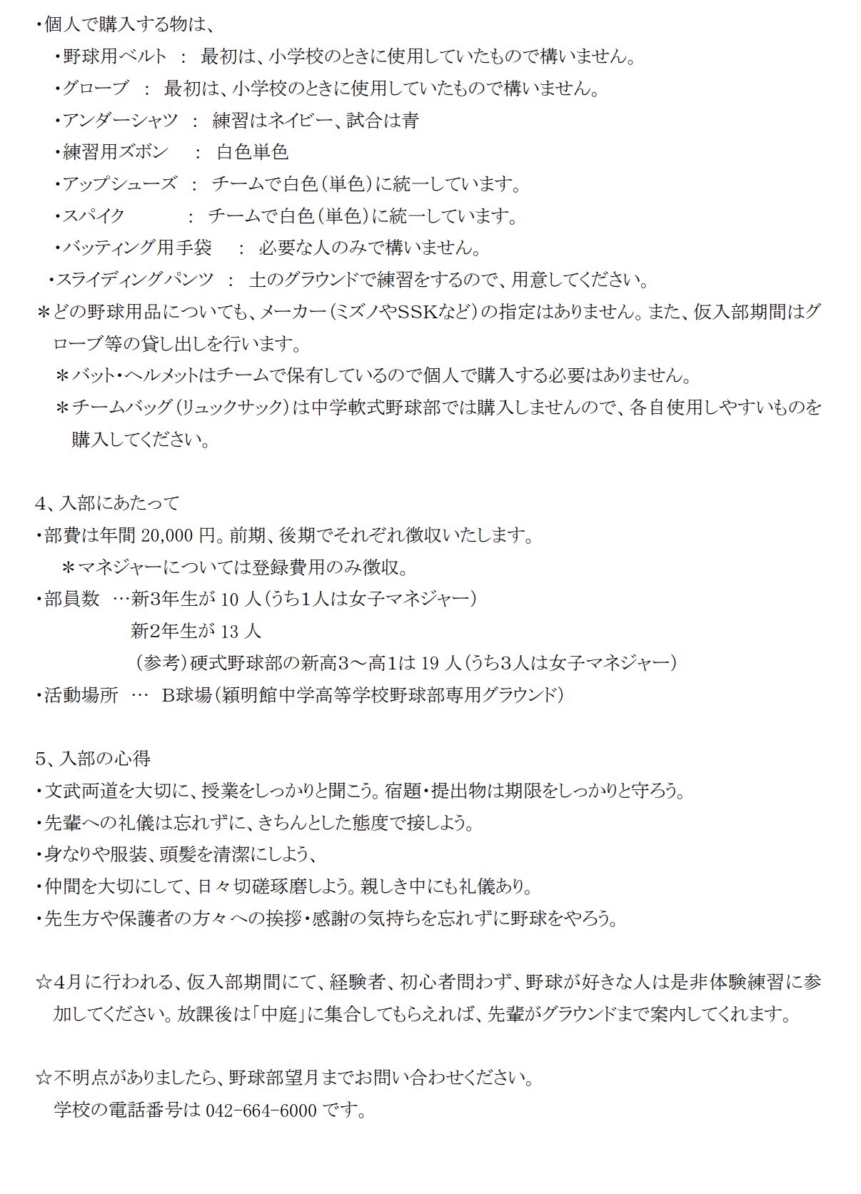 本日4/13は新中学一年生を対象とした生徒会オリエンテーションがあります。中学軟式野球部と高校硬式野球部から部活動についての説明があります。4/14から仮入部がスタートするので、見学や仮入部を希望する生徒は、日程と添付した資料をご確認下さい。何かご質問や、問い合わせがありましたら、いつでもご連絡ください。