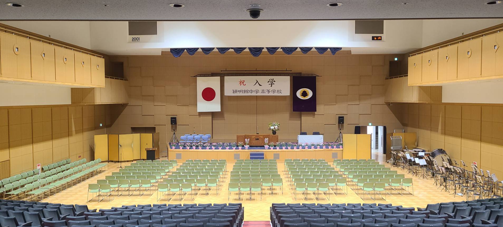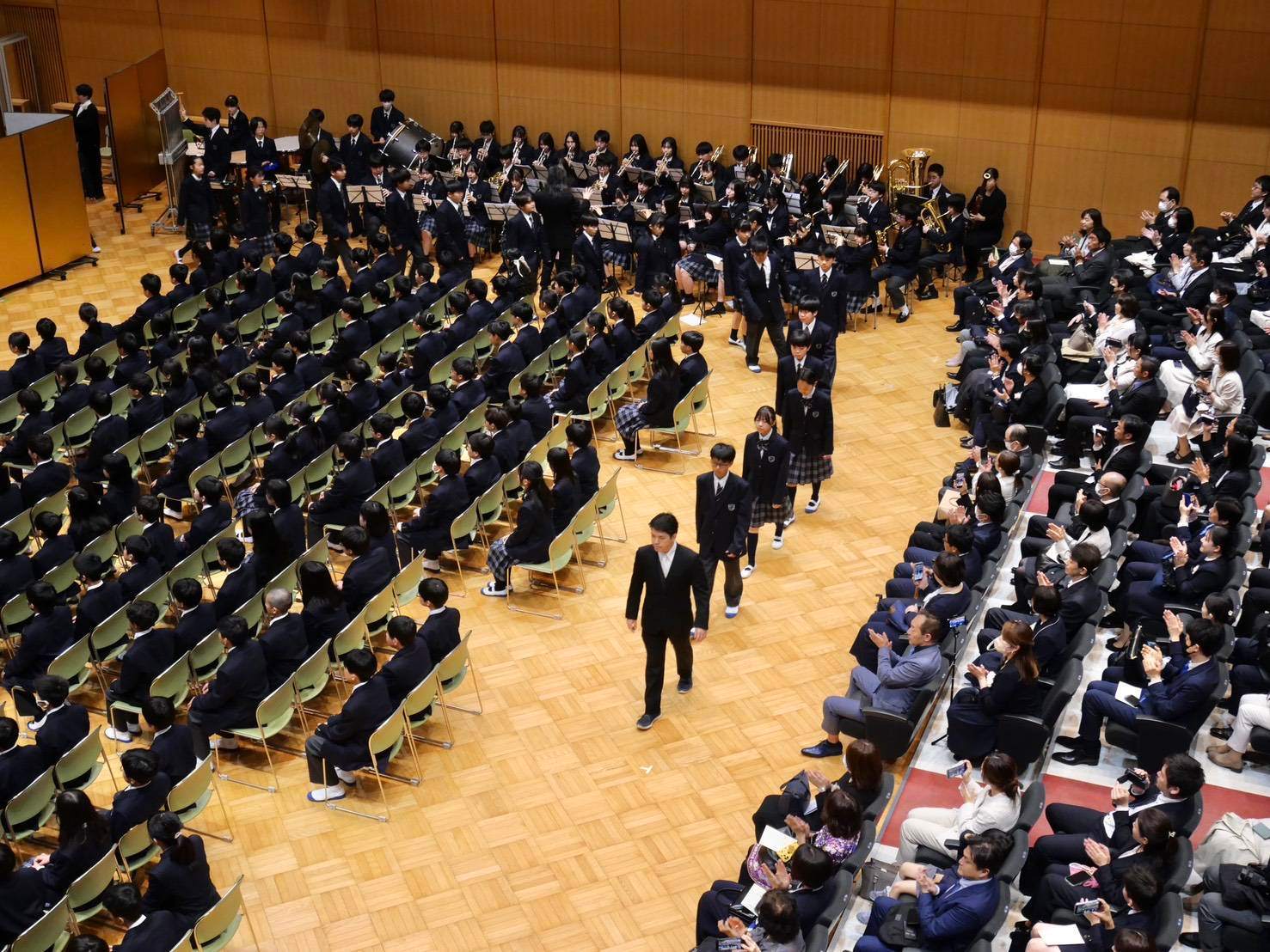 令和8年度入学式が行われ、吹奏楽部は椅子並べ、清掃などの準備のほか、「入場曲」の演奏と「国歌」「校歌」の伴奏を行いました。