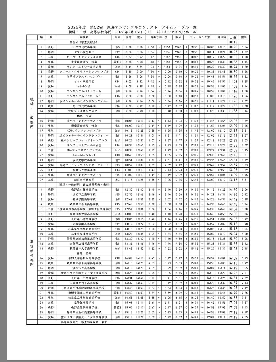 東海アンサンブルコンテストタイムテーブル発表