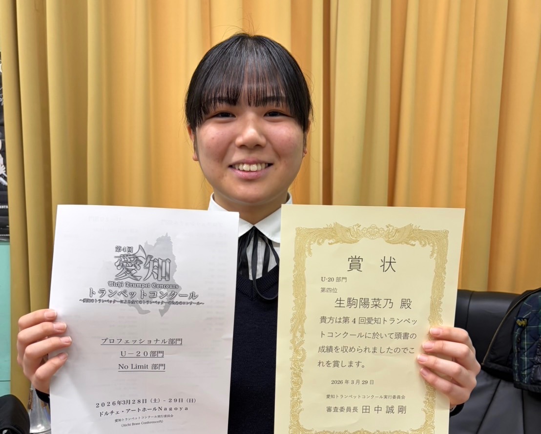 愛知県トランペットコンクールで二年生の生駒さんが4位入賞。