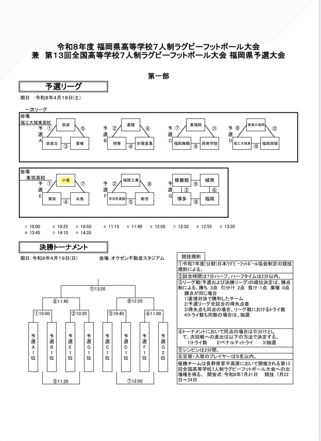 第13回全国高等学校7人制ラグビーフットボール大会福岡県予選大会の組合せが発表されました。