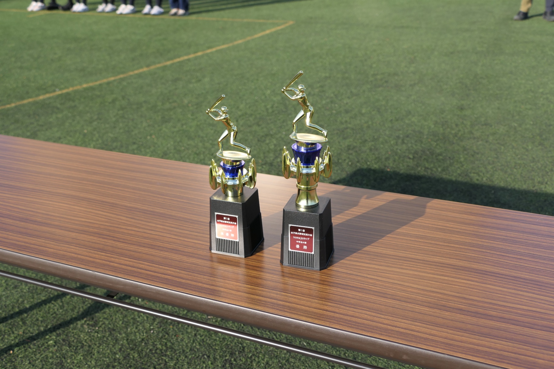 決勝戦後、優勝・準優勝チームを対象に表彰式を行いました。ここでは、株式会社スポーツマリオ様から、優勝杯・準優勝杯を贈呈。加えて協力企業のゼット株式会社様より、最優秀賞と敢闘賞で各種景品をいただきました。