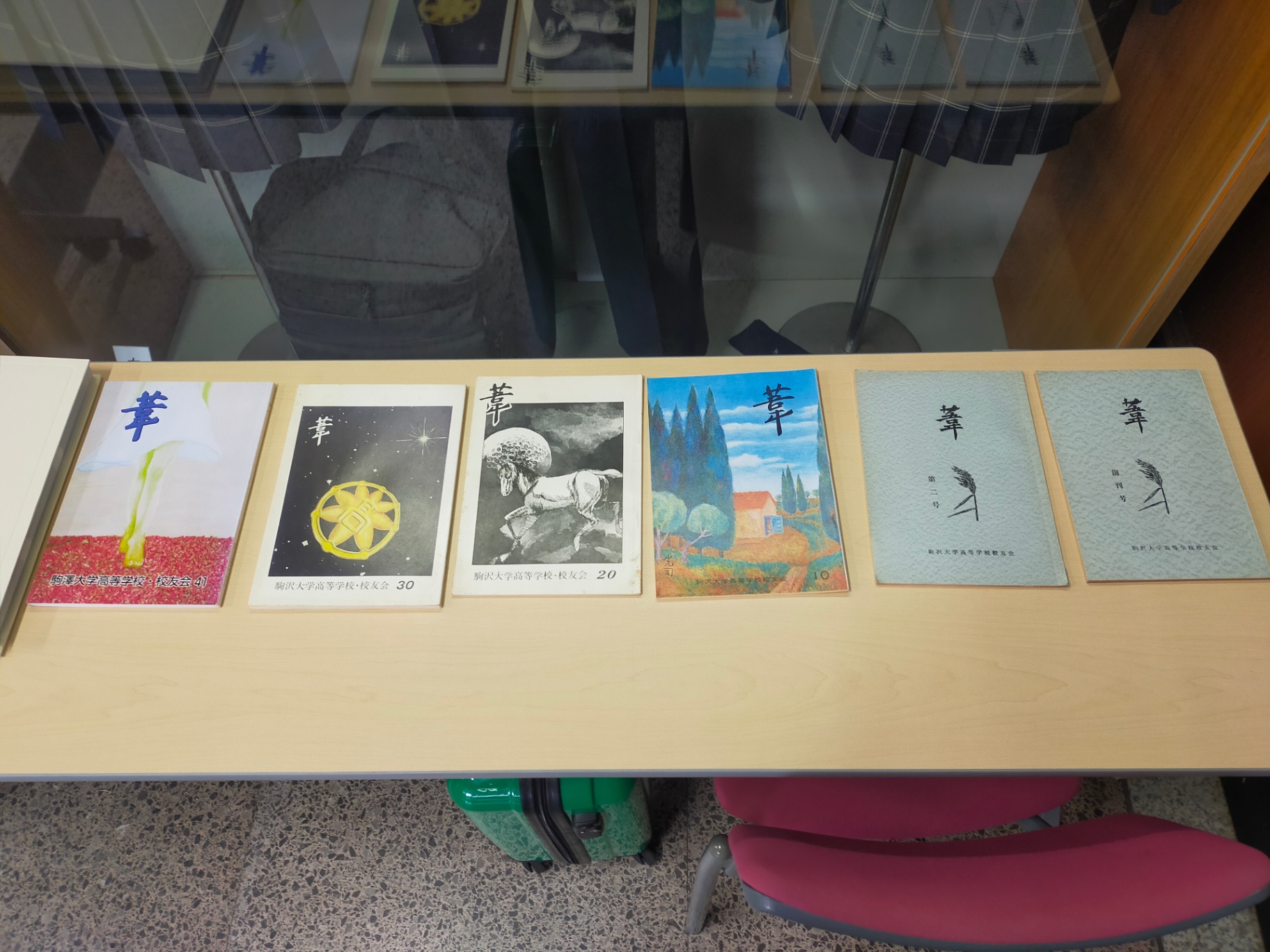 ブースには同窓会20周年から10年おきに70周年までの記念誌、図書室に保管されている1960年から10年おきに2010年までの卒業アルバム、『葦』の創刊号から10号ごとに41号までそれぞれ自由に閲覧できる様に展示しました。