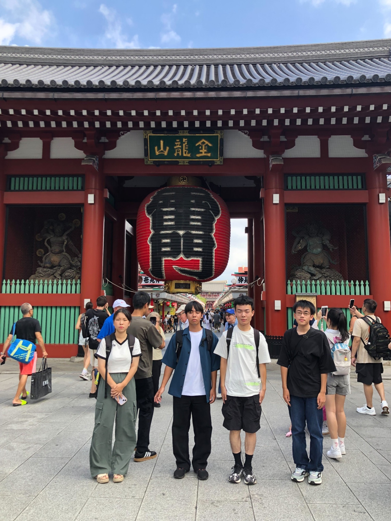 夏休みのフィールドワーク東京編のスタートは、有名な浅草雷門です。「雷門」の語源は門の左右に祀られている風神と雷神で、「風雷神門」という呼び方もあるそうです。ちなみに、提灯の表の文字は「雷門」ですが、裏は「風雷神門」になっていました。(トップ画像をみてください)