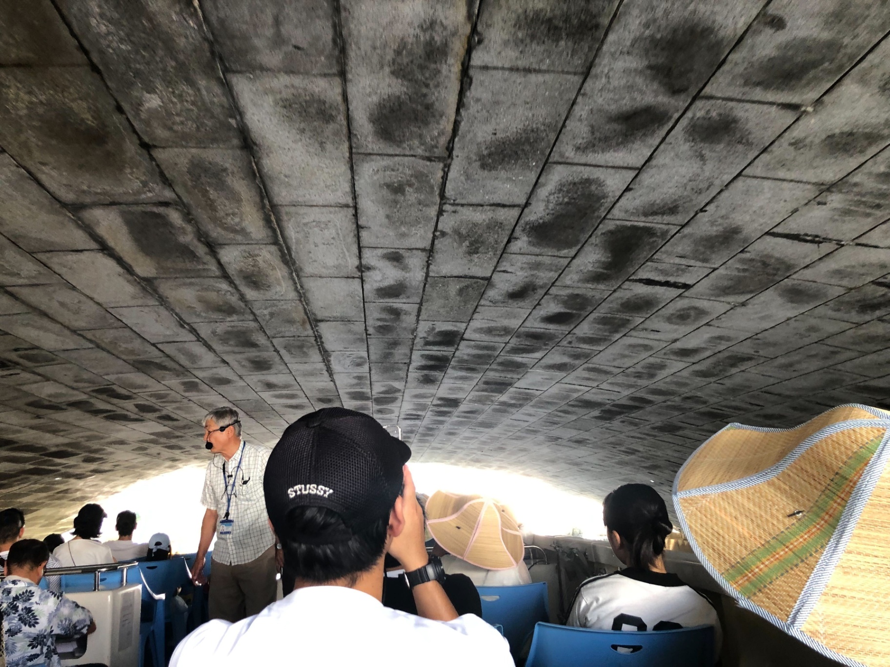 船がゆっくりと動き始めました。この日は日射しが強かったので、参加者には麦わら帽子と団扇が配られていました。
