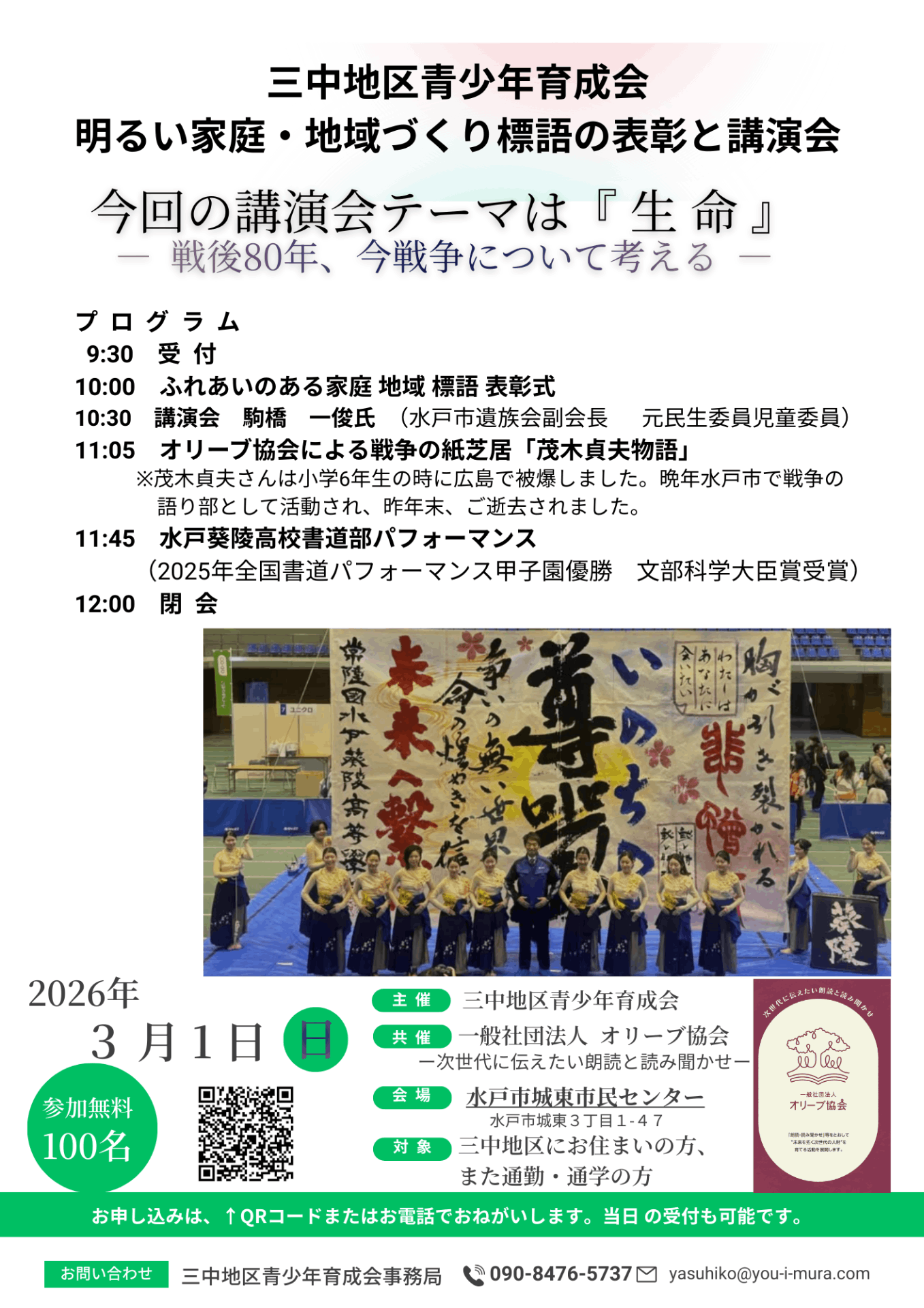 水戸三中学区での講演会で生命について書道パフォーマンスをさせていただきました