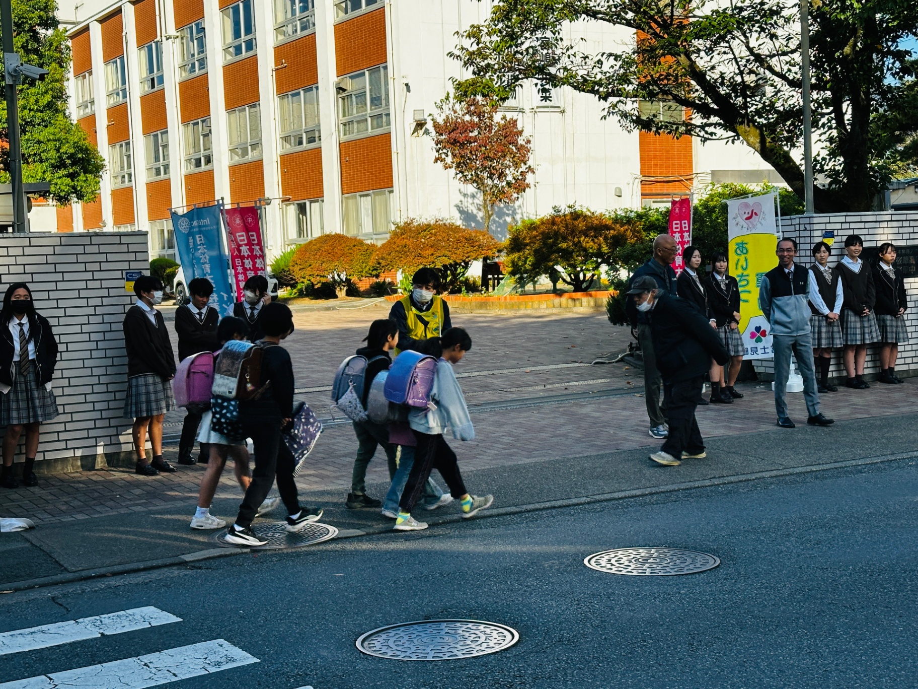 深まりつつある秋の寒さに負けず、インターアクターが笑顔で、気持ちよくあいさつしていました。