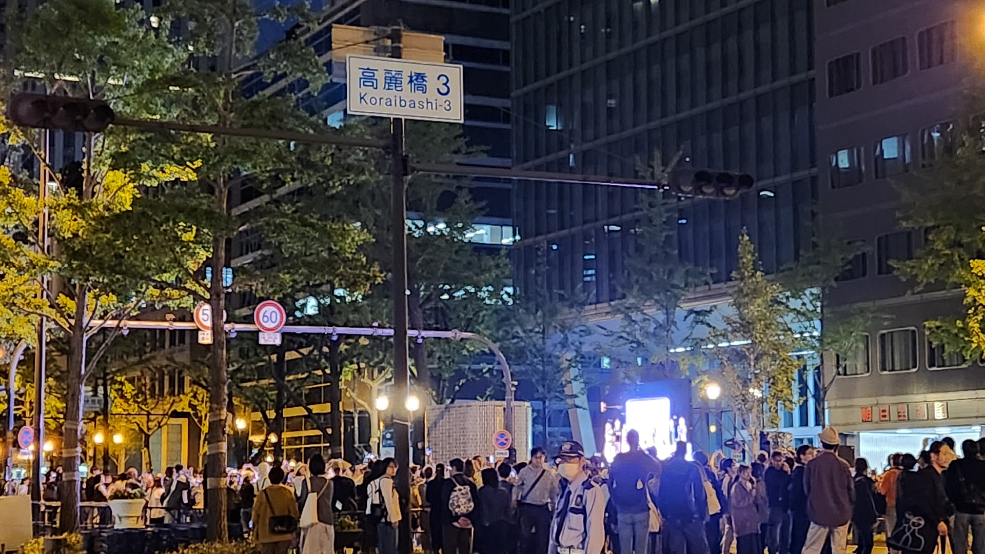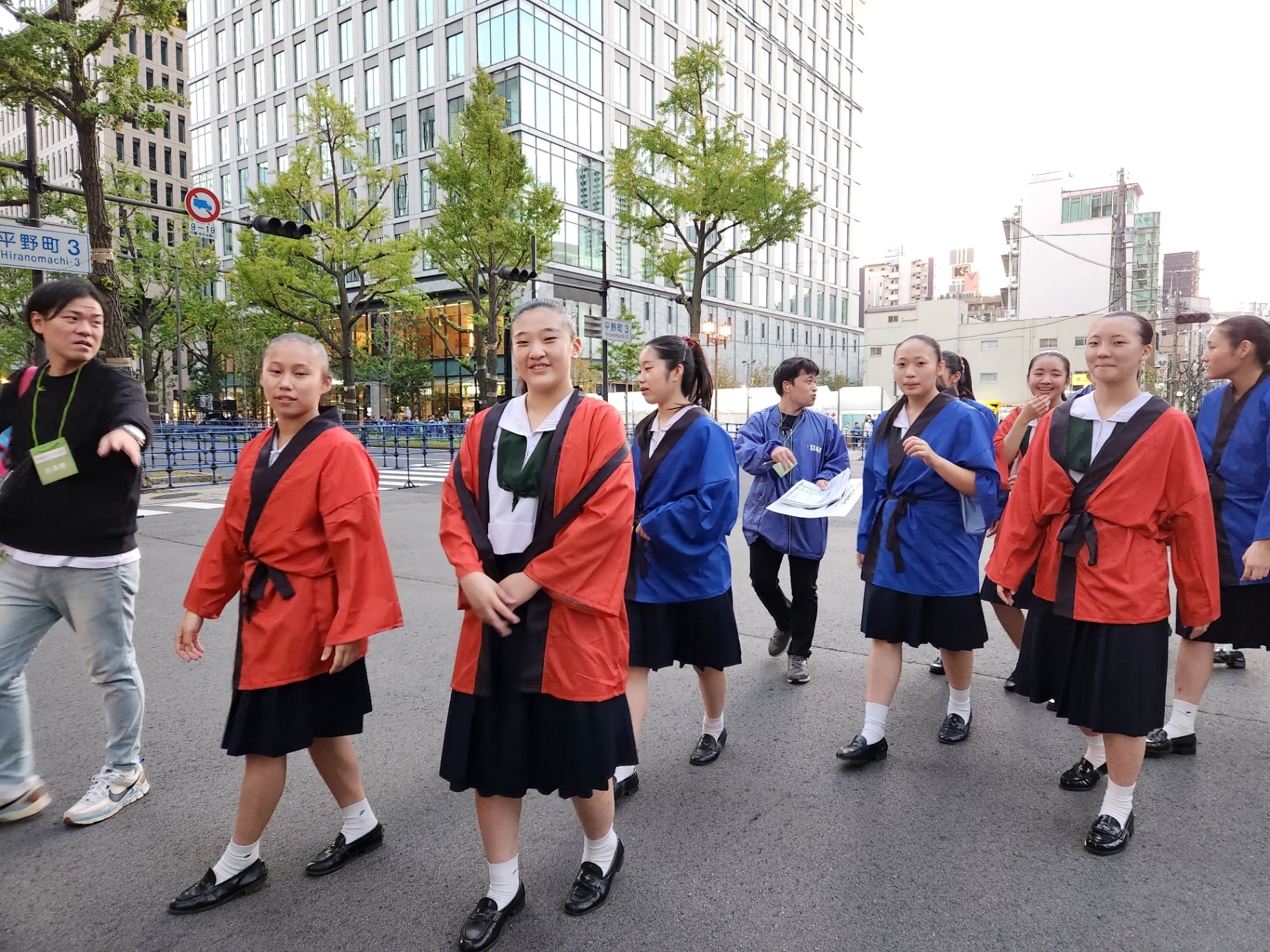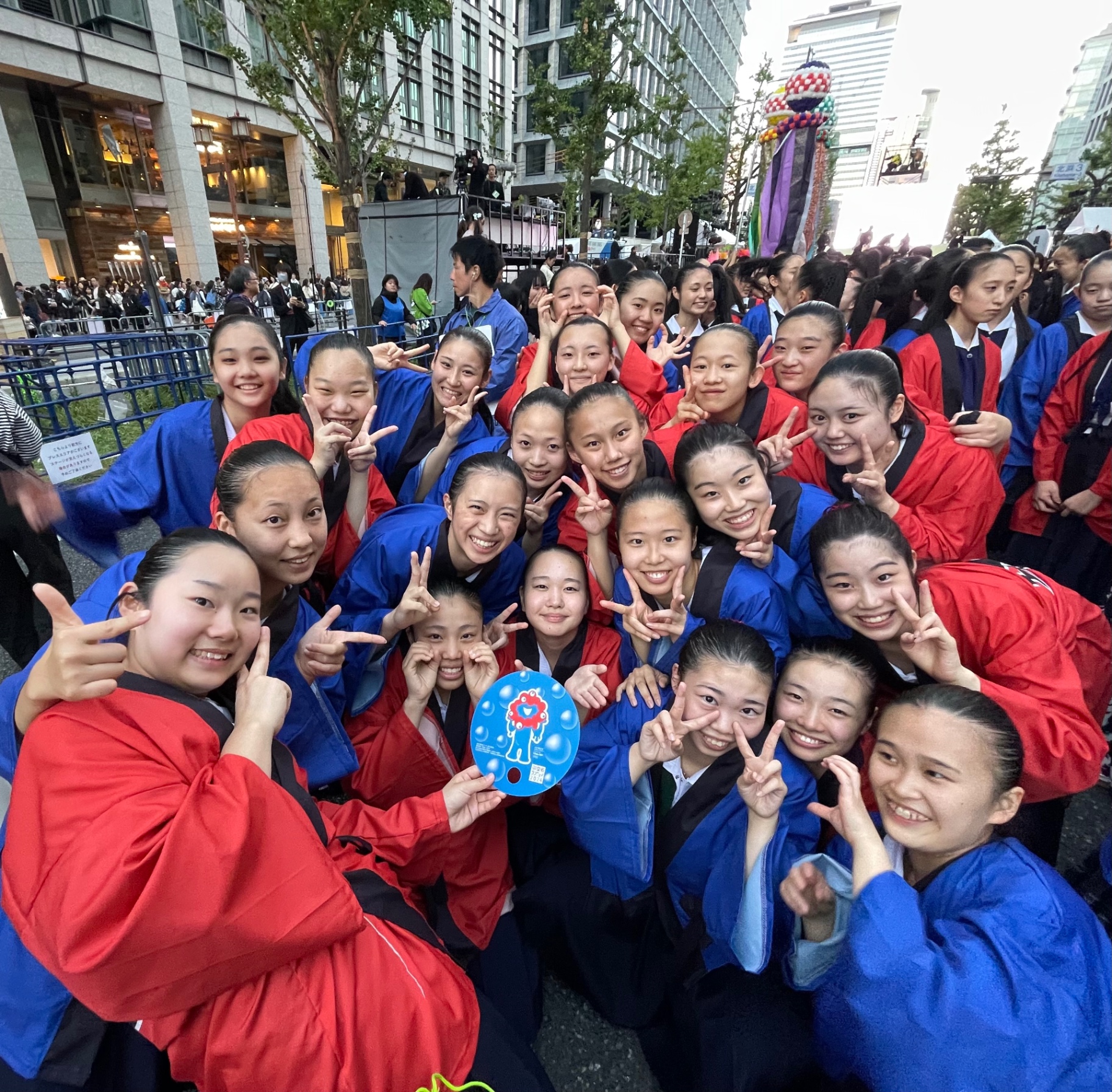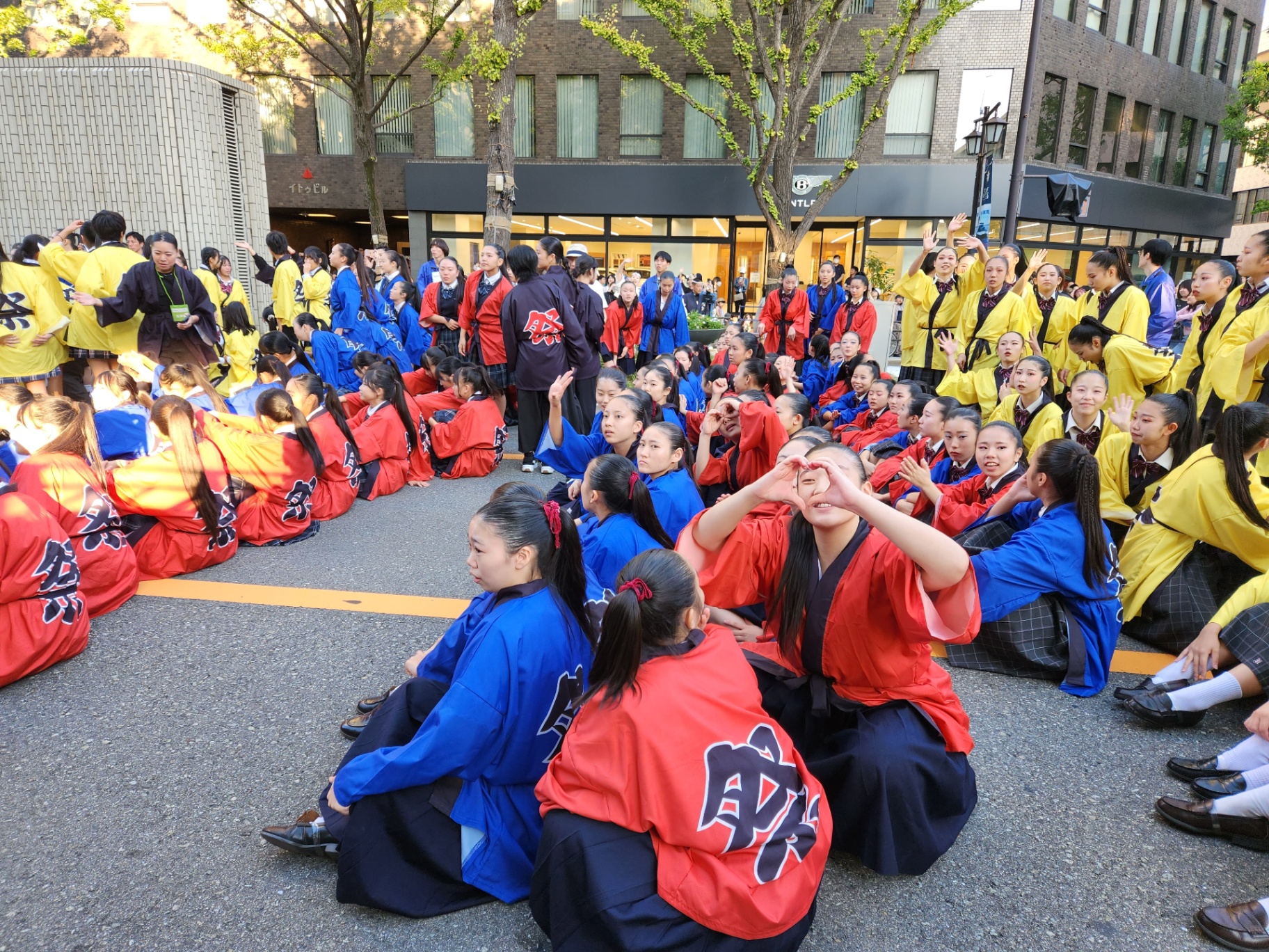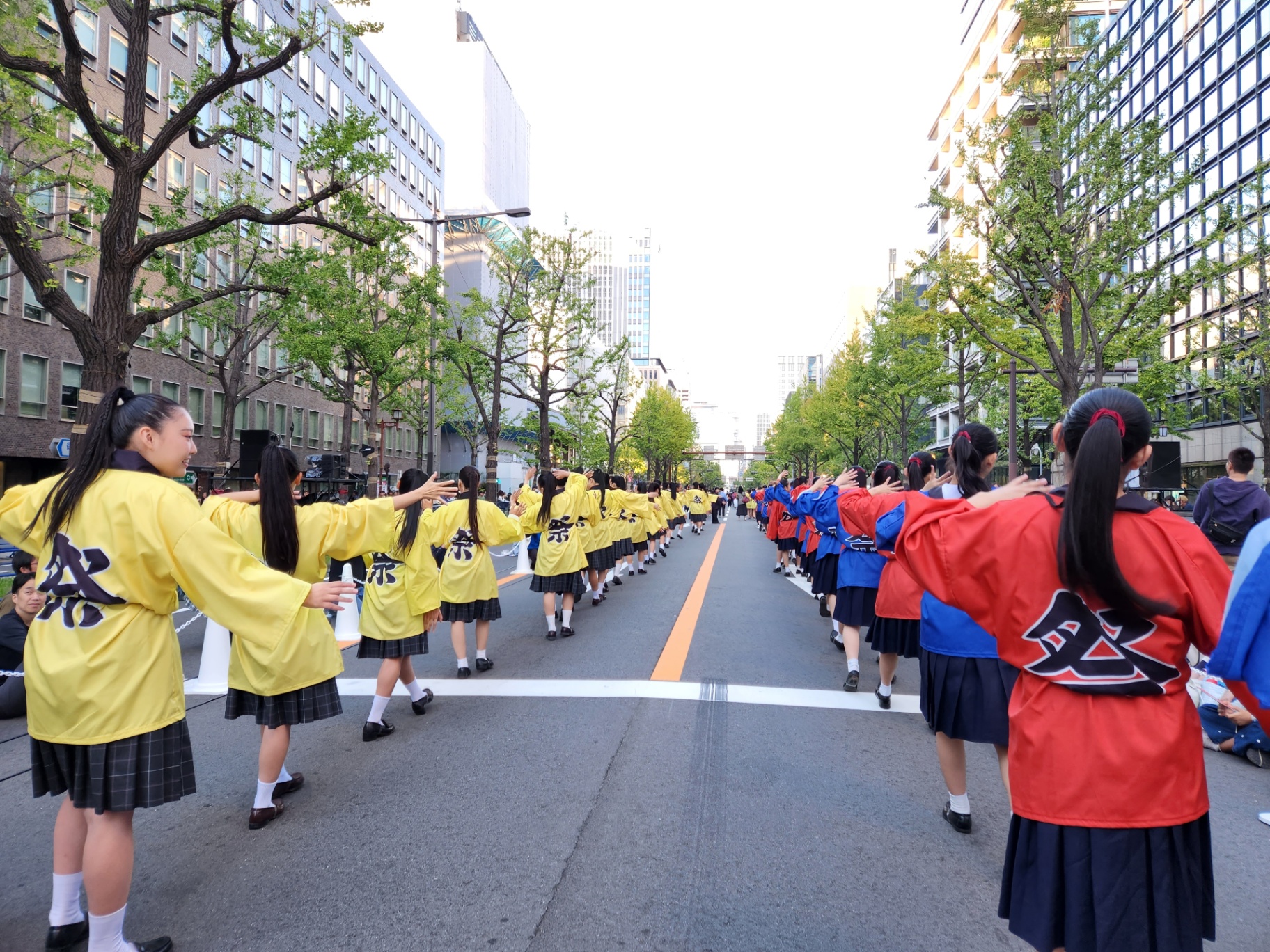 開幕パフォーマンスとして「謎の制服おかっぱ集団」で人気を呼んでいるアバンギャルディさんと、大阪府内の高校ダンス部がコラボレーションをしました。総勢300人を超えるメンバーで、5曲のアニメソングメドレーを披露させていただきました。会場にいる皆さんと一緒にイベントを盛り上げることができ、制服を着て路上で踊ること、サイリウムを光らせて踊ることなど、滅多にない経験をさせていただき、部員一同楽しむことができました!そして他学校の皆さんと交流することができ、とても濃い時間を過ごしました!