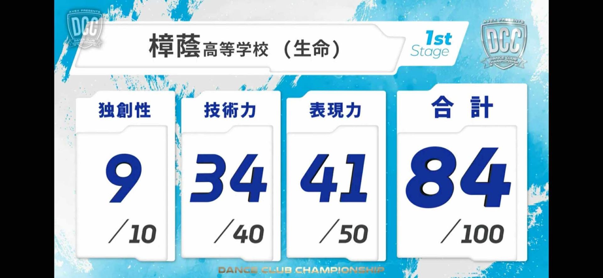樟蔭は独創性 9点。技術力34点。表現力41点。合計が84点でBブロック1位通過をすることができました。