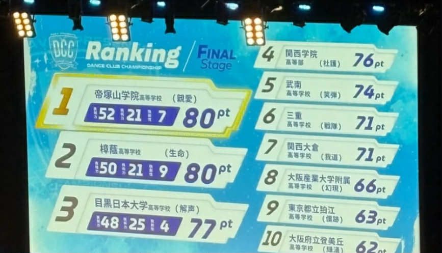 Final Stageを終え、スクリーンに映し出された得点は、独創性9点・技術力21点・表現力50点の合計80点。暫定一位になることができましたが、まだ残りの5校が演技を終えていないため、すごくドキドキしたまま最終結果を待つことに。舞台裏で他の学校の演技や得点発表を見ていましたが、9校目が終わるまで樟蔭が暫定1位。