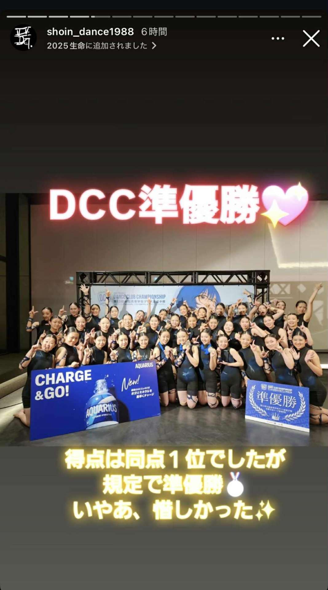悔しい気持ちでいっぱいでしたが、あの大きな舞台で2度も踊ることができ、このメンバーで、この作品で結果をいただくことができてとても嬉しかったです。 この作品を通して全てが奇跡でできているのだと実感しました。保護者の方や、監督、顧問の先生方、コーチのみなさんにたくさんサポートをしていただきました。