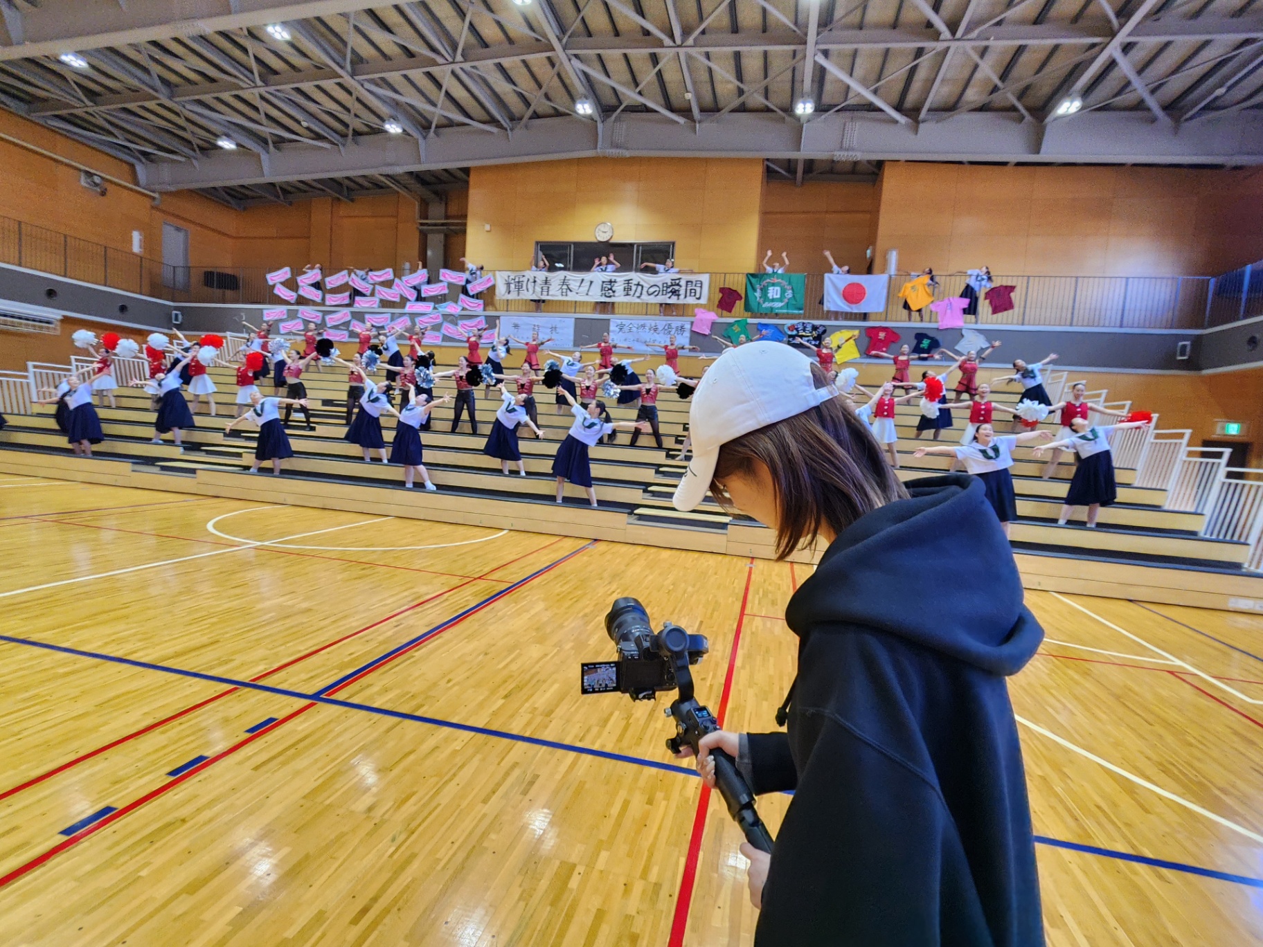 100年会館という大きな体育館で、上下左右と奥行きを最大限に使い、立体感を。みんなの気合も十分で、今までにない撮影現場になったと思います。後ろの壁や手すりには、各クラブのタオルやTシャツ、横断幕、書き初めなどを貼り、飾り付けをしました。