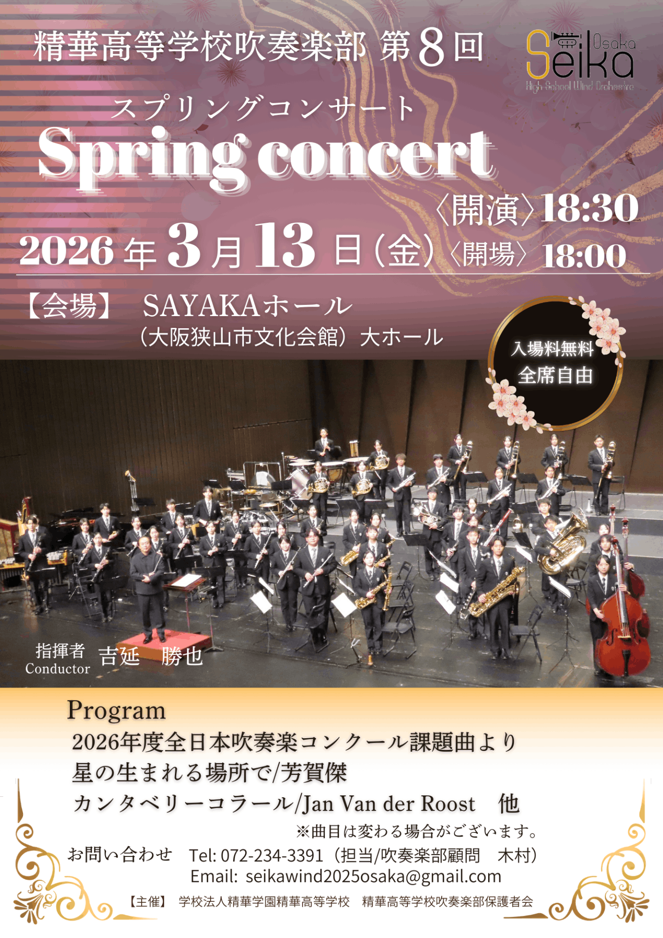 今年もいつものSAYAKAホールで2026年度コンクール課題曲や『星の生まれる場所で』(芳賀傑)、『リバーダンス』(ウィーラン)などポップス曲を中心に楽しいコンサートになります。予約は不要、全席指定席で入場無料となっていますので、お気軽にご来場ください。
