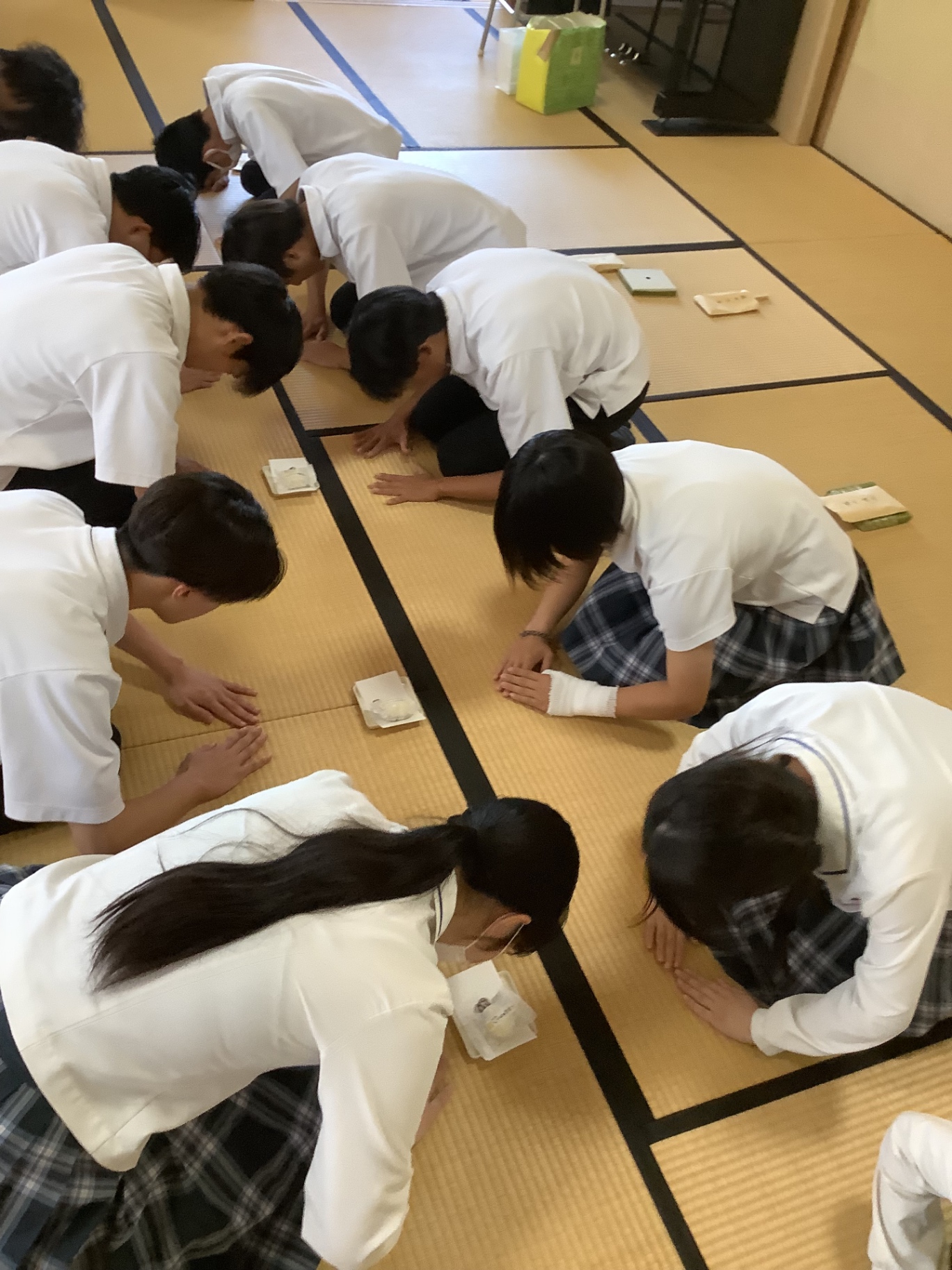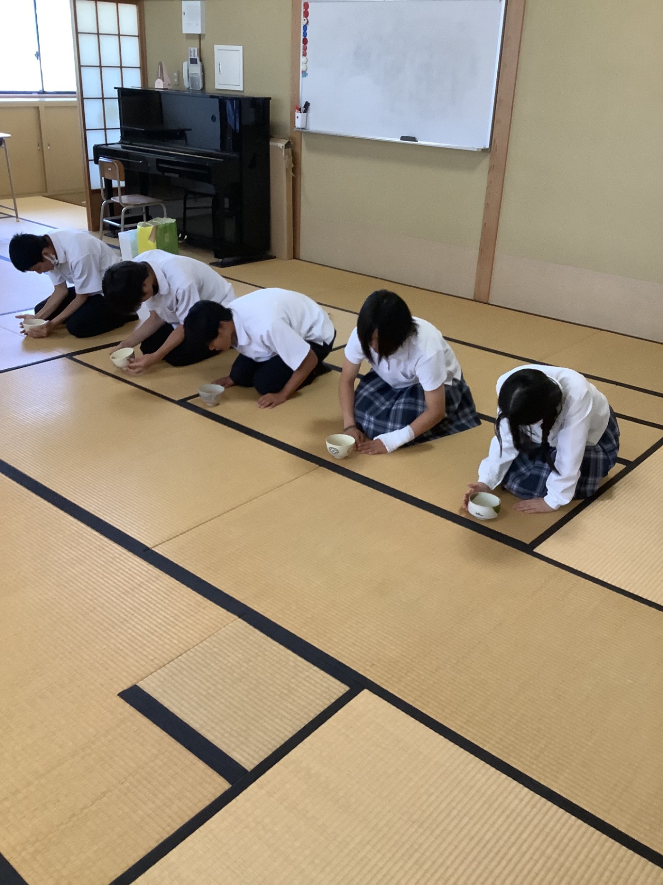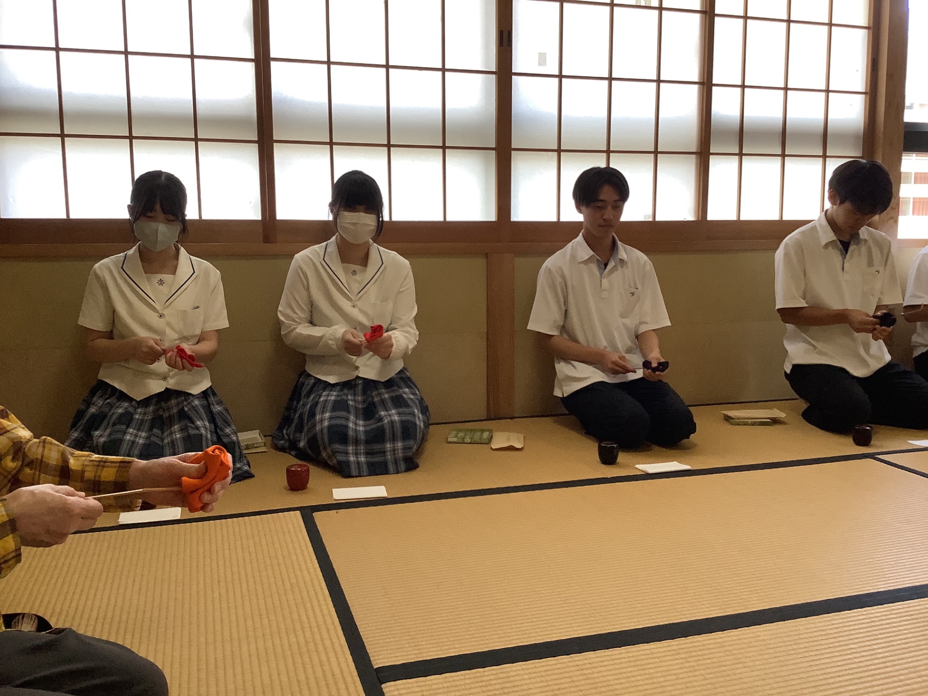 総合選択の生徒は、週に1時間「茶道」の授業を実施しています。礼儀作法を学び、美味しいお抹茶と美味しいお茶菓子を味わっています。
