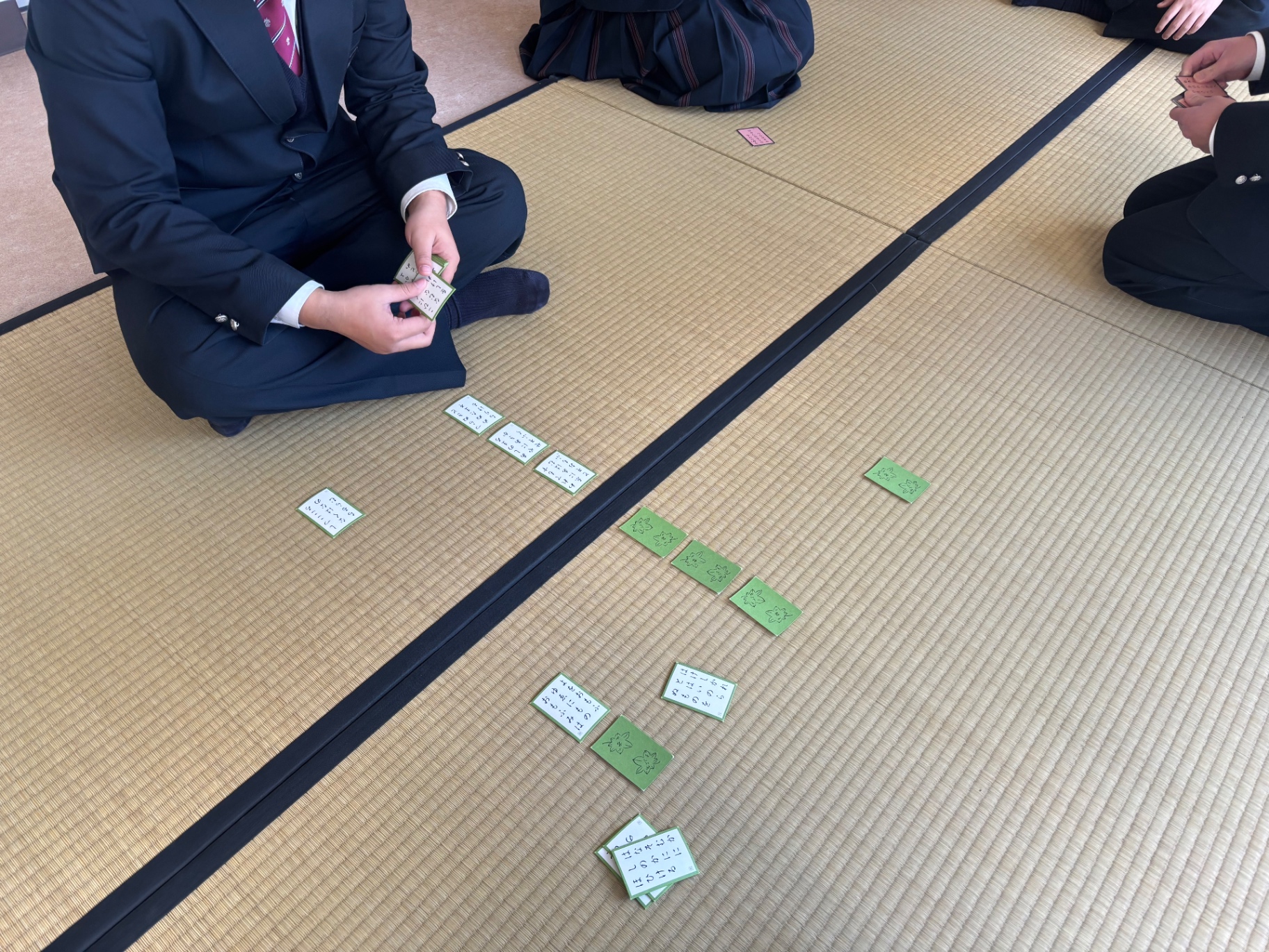 生徒会主催でクリスマス会が行われ、百人一首部も「百人一首体験コーナー」として出演しました!みんなで畳を伝統文化教室から運び出し、セッティング。部活に向かう子や、クリスマス会を見に来た子が興味を持ってくれて体験してくれることに…!