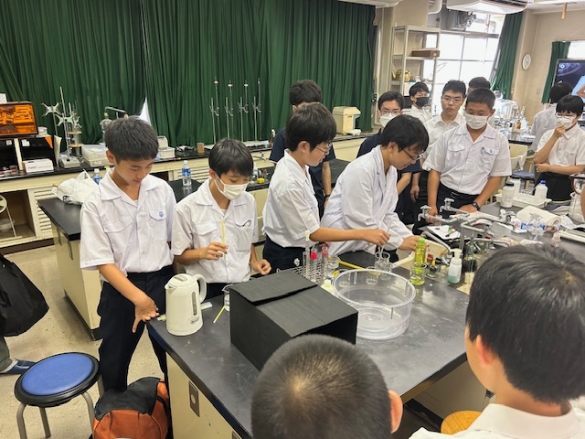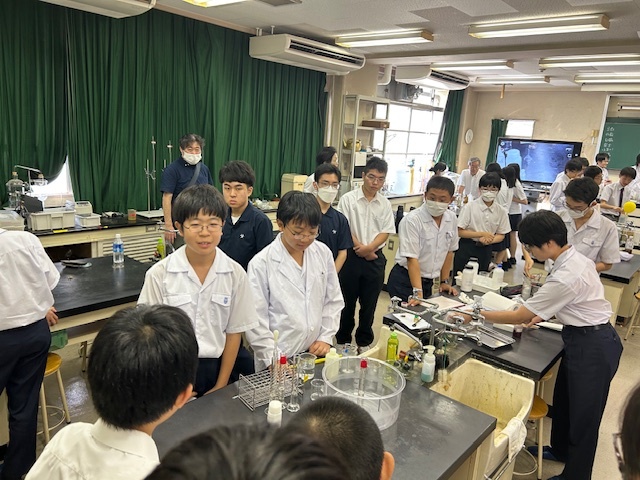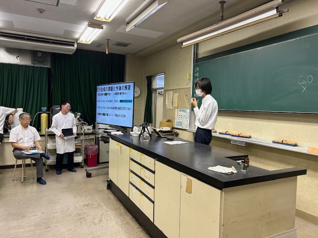 本校は固形燃料の研究発表,指示薬の合成報告,化学電池の研究報告,化学反応と温度との関係の演示実験、低学年児童に向けた体験実験の提供を行いました。