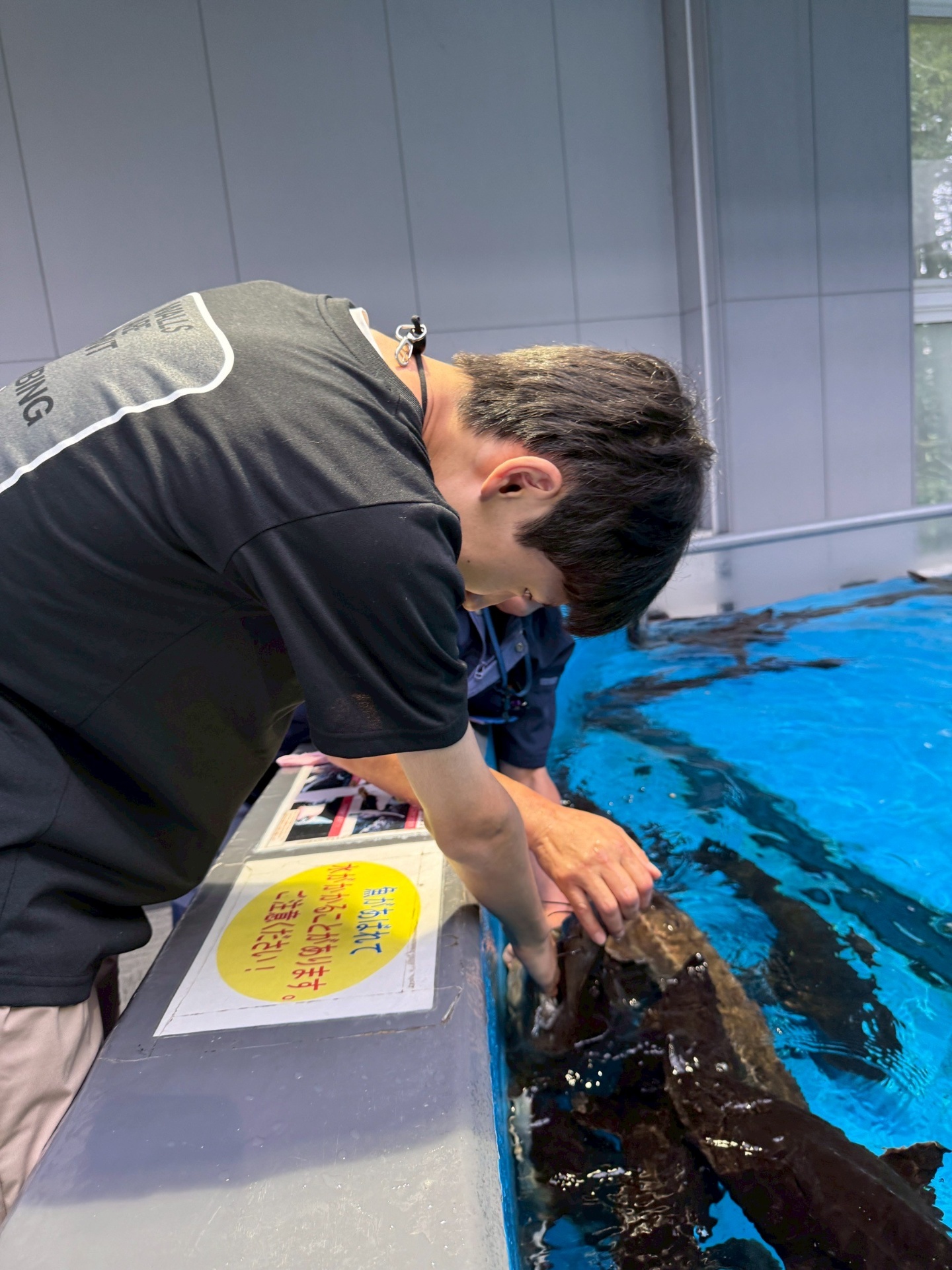 写真はチョウザメに手をかまれる体験をしているところです。