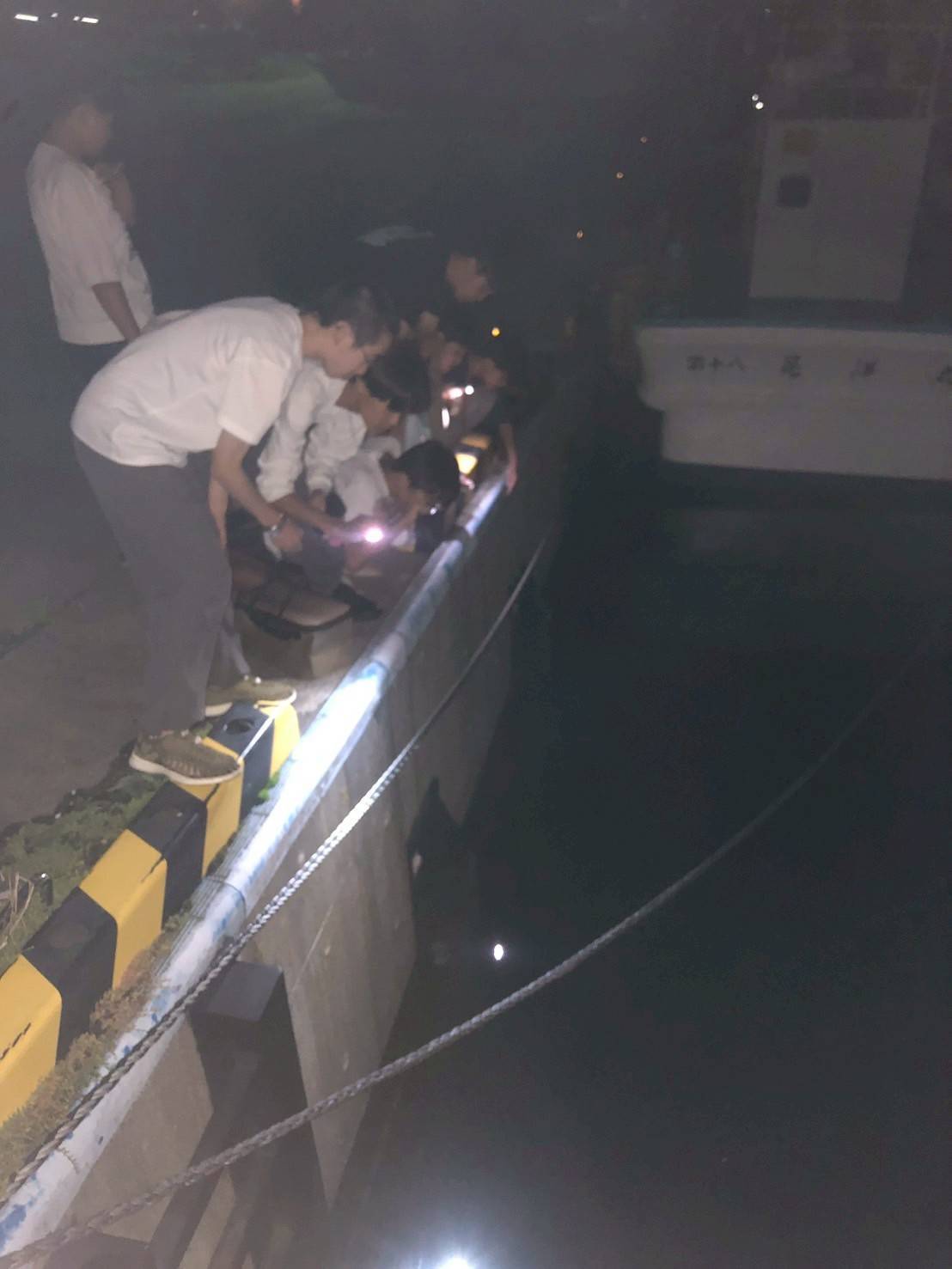 夜のウトロの漁港で魚を探す班員たち。