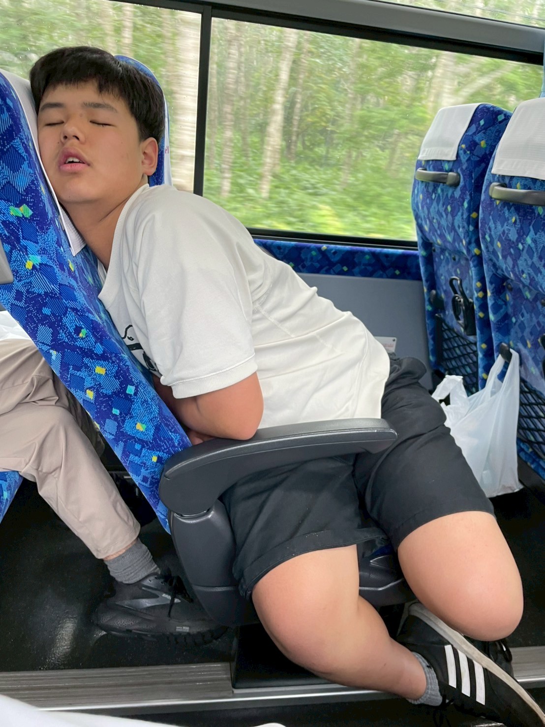 最終日の空港に向かうバスのなかで疲れて寝ている班員。