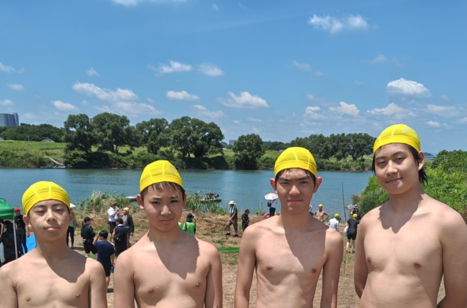 7月21日(月祝)に茨城県水戸市で開催された第35回那珂川遠泳大会に水泳班の4人が参加しました。 千歳橋から水府橋までの3.5kmを、約20名をひとつの 組にして4人×5列の隊列で、計72名が泳ぎました。生徒たちは2つめの組の3列目を、前列との間隔やお互いの間隔を調整しながら泳ぎました。