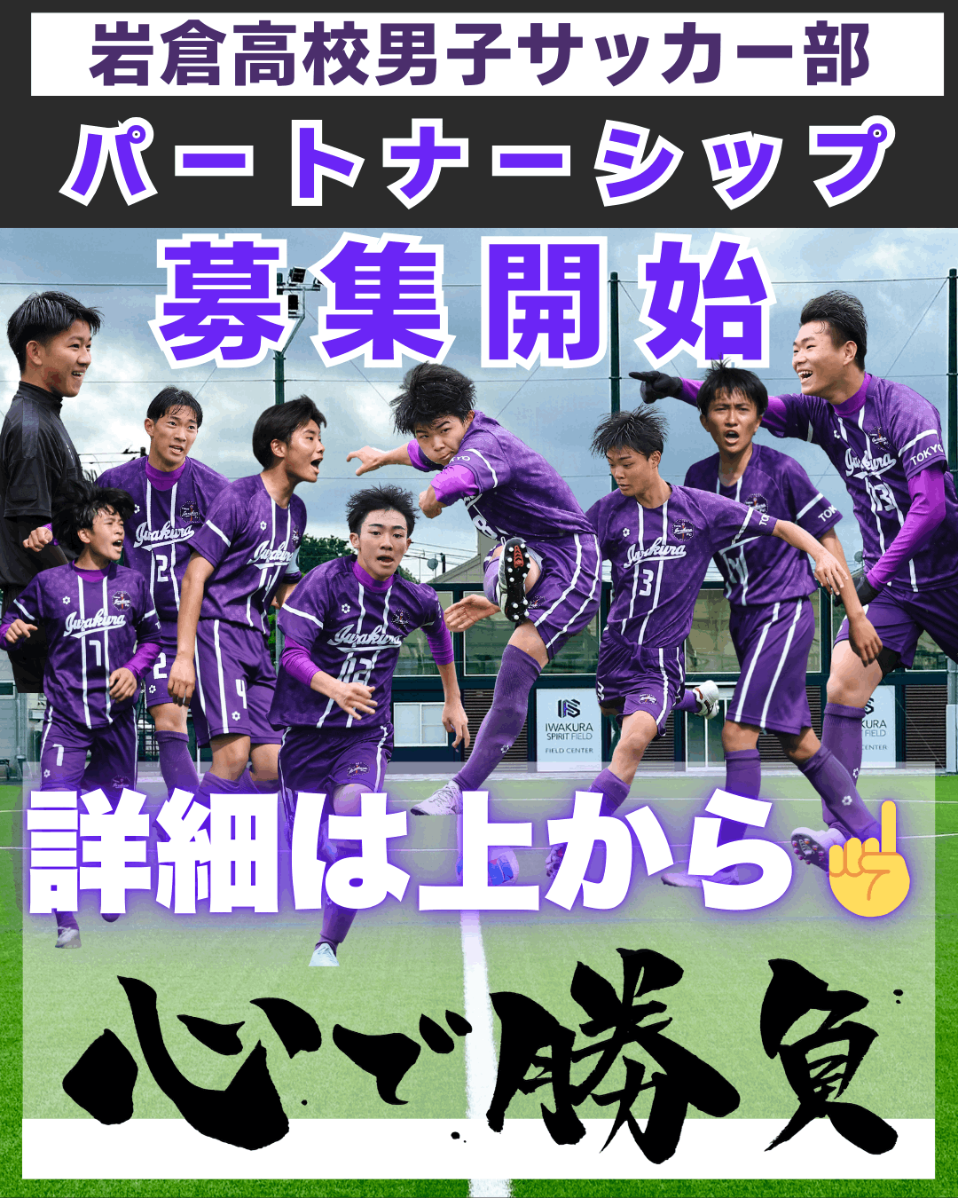 🟣本校サッカー部の活動を、より多くの方々に共感してもらえるように「心で勝負」の文字を分かりやすく漢字にして、上部中央に置くことで存在感をだしました。